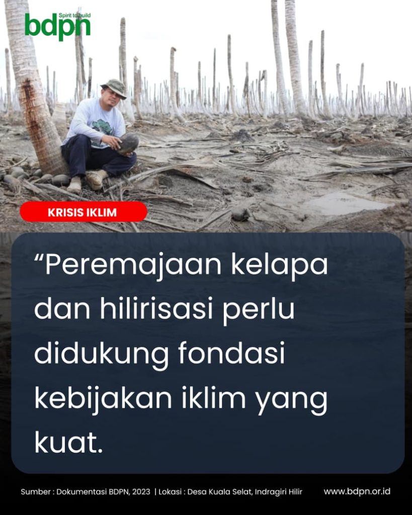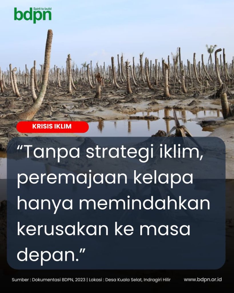 Tanpa penanganan yang sistematis terhadap faktor-faktor lingkungan tersebut, bibit yang ditanam hari ini berisiko besar menghadapi nasib yang sama dengan kebun-kebun yang rusak sebelumnya. Peremajaan kelapa, dalam konteks ini, tidak boleh dipahami semata sebagai program teknis pertanian, melainkan harus ditempatkan dalam kerangka besar ketahanan iklim wilayah pesisir dan hulu Indragiri Hilir.