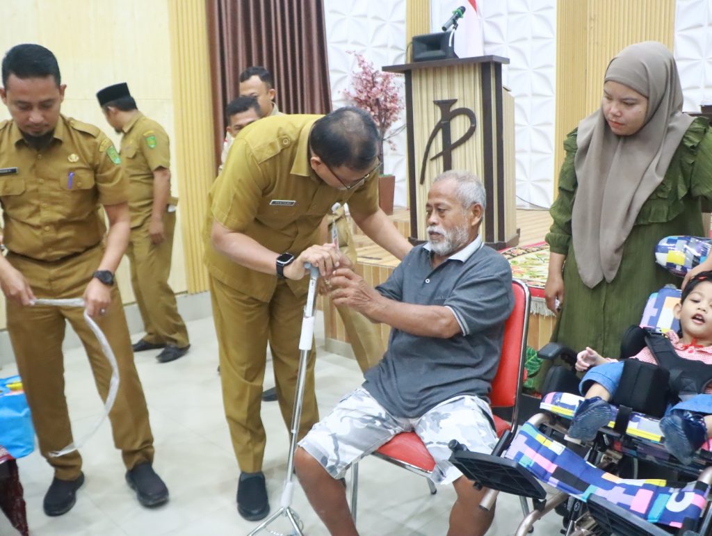 Sebagai penutup rangkaian acara, dilakukan penyerahan bantuan sosial oleh Bupati berupa kursi roda, tongkat kaki tiga, alat bantu dengar, serta bantuan nutrisi kepada para penerima manfaat secara simbolis. (Mhd)