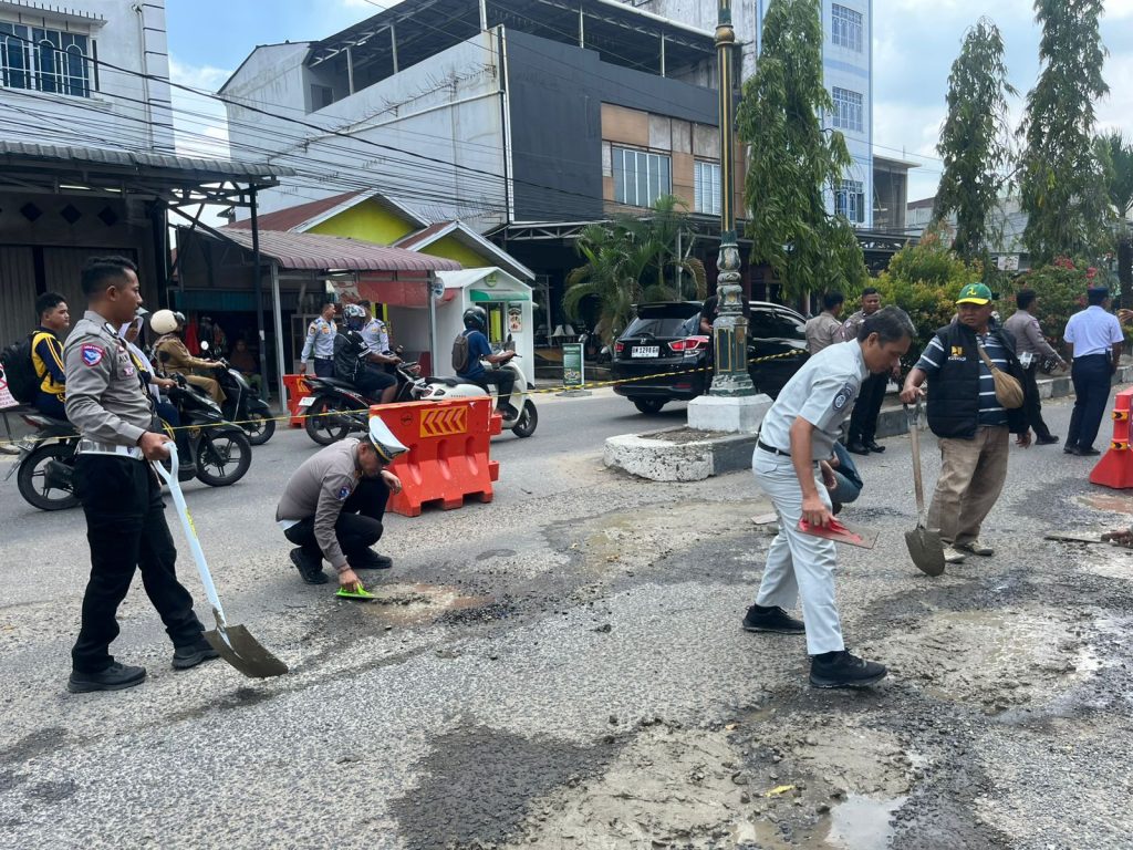 Tembilahan – Dalam rangka mengantisipasi terjadinya kecelakaan lalu lintas selama pelaksanaan Operasi Keselamatan Lancang Kuning (LK) 2026, Satgas Preventif Polres Indragiri Hilir bersama stakeholder Forum Lalu Lintas dan Angkutan Jalan (LLAJ) Kabupaten Indragiri Hilir melaksanakan kegiatan tambal sulam semenisasi jalan berlubang di sejumlah titik jalan protokol dalam Kota Tembilahan.