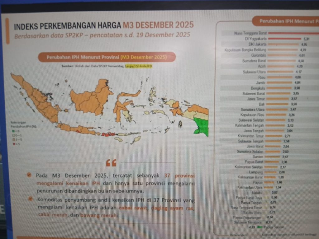 Berdasarkan paparan dalam rakor, Indeks Perkembangan Harga (IPH) Minggu ke-3 Desember 2025 menunjukkan bahwa sebanyak 37 provinsi mengalami kenaikan IPH dibandingkan bulan sebelumnya. Kenaikan IPH tersebut secara nasional dipengaruhi oleh sejumlah komoditas pangan utama yang berbeda menurut wilayah.