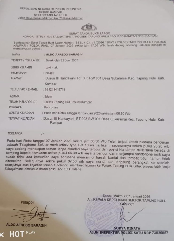 Kampar, Riau — Polisi lakukan olah TKP sebagai langkah awal membongkar teror pencurian yang selama ini menghantui warga Tapung Hulu. Keseriusan Polsek Tapung Hulu dalam mengungkap dugaan tindak pidana pencurian satu unit Android milik Aldo Afredo Saragih, anak Wakil Ketua Umum DPP Solidaritas Wartawan Indonesia (SWI) Pajar Saragih, kini mulai terlihat nyata di lapangan.