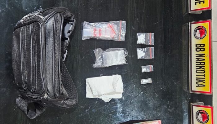 Selain itu, turut diamankan satu buah tas hitam bertuliskan SEA-ZONN, satu unit timbangan digital, uang tunai sebesar Rp500.000,- serta satu unit handphone merk Vivo warna hitam yang diduga digunakan untuk transaksi.