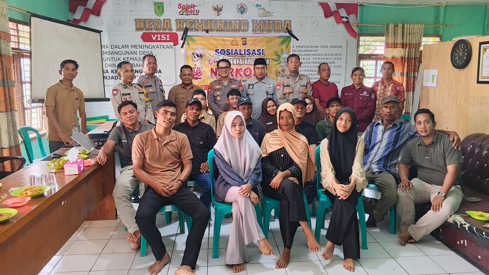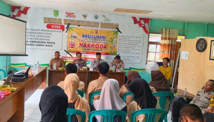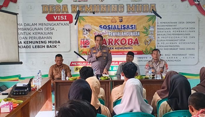 Indragiri Hilir – Dalam upaya mencegah penyalahgunaan narkoba sejak dini, Polsek Kemuning menggelar kegiatan sosialisasi kepada masyarakat dan remaja di Aula Kantor Desa Kemuning Muda, Kecamatan Kemuning, Kabupaten Indragiri Hilir, Kamis (23/4/2026) sekitar pukul 10.00 WIB.