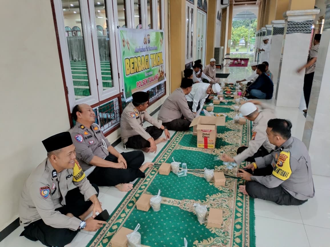 Sebanyak 100 paket berbuka diserahkan kepada pengurus masjid untuk dibagikan kepada para jemaah yang melaksanakan ibadah puasa. Penyerahan dilakukan secara langsung oleh Panit Binmas dan beberapa personil sebagai bentuk kepedulian dan kebersamaan Polri dengan Jamaah Masjid.