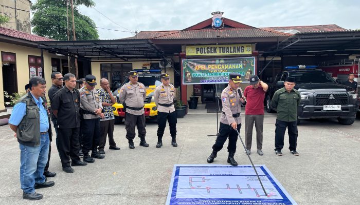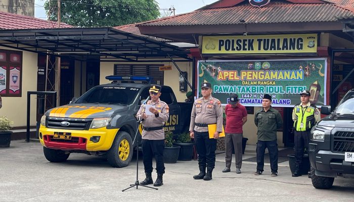 Siak, Peawang— Dalam rangka memastikan keamanan dan ketertiban masyarakat pada malam takbiran, Polsek Tualang melaksanakan Apel Kesiapsiagaan Pengamanan Pawai Takbir Idul Fitri 1447 H / 2026 M, Kamis (19/3/2026) pagi.