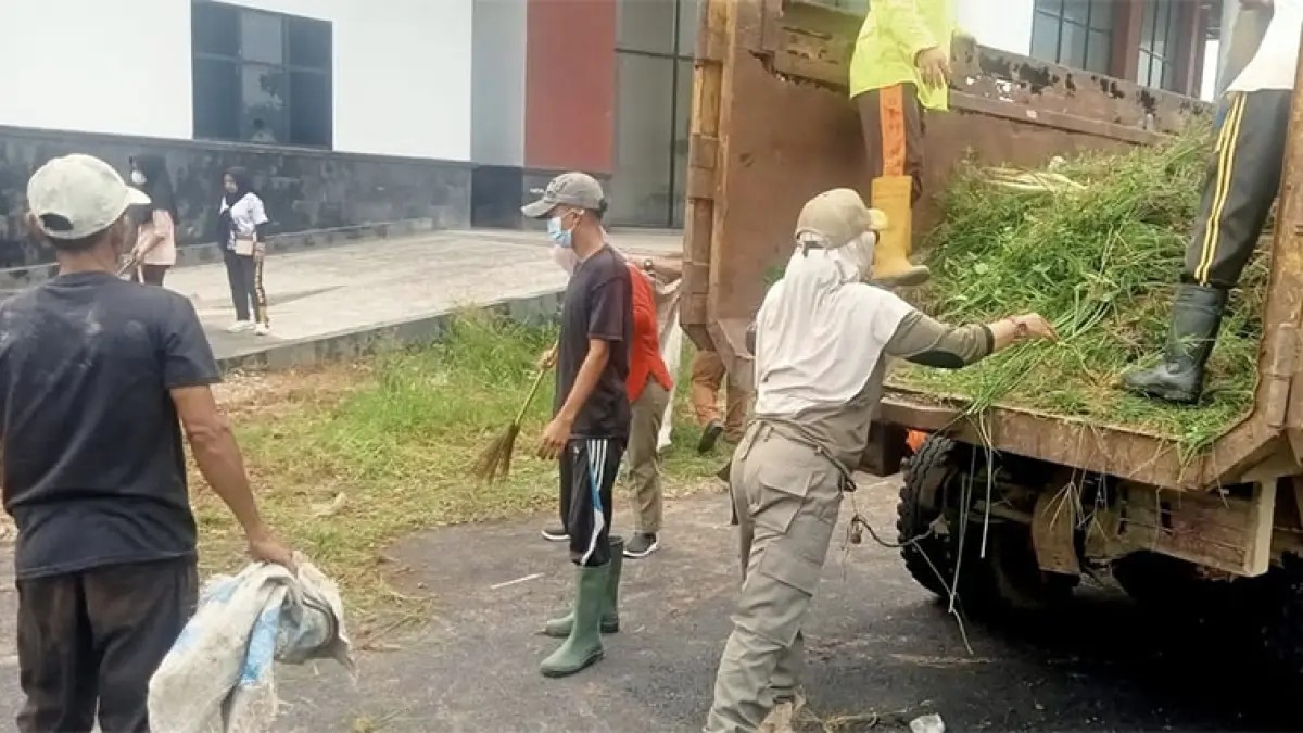 Para personel terlihat membersihkan sampah di saluran drainase, menebas rumput dan ilalang yang sudah tinggi serta merapikan lingkungan sekitar gedung daerah. Selain menata taman dan tanaman hias di pekarangan, guna menciptakan lingkungan yang lebih rapi dan nyaman.