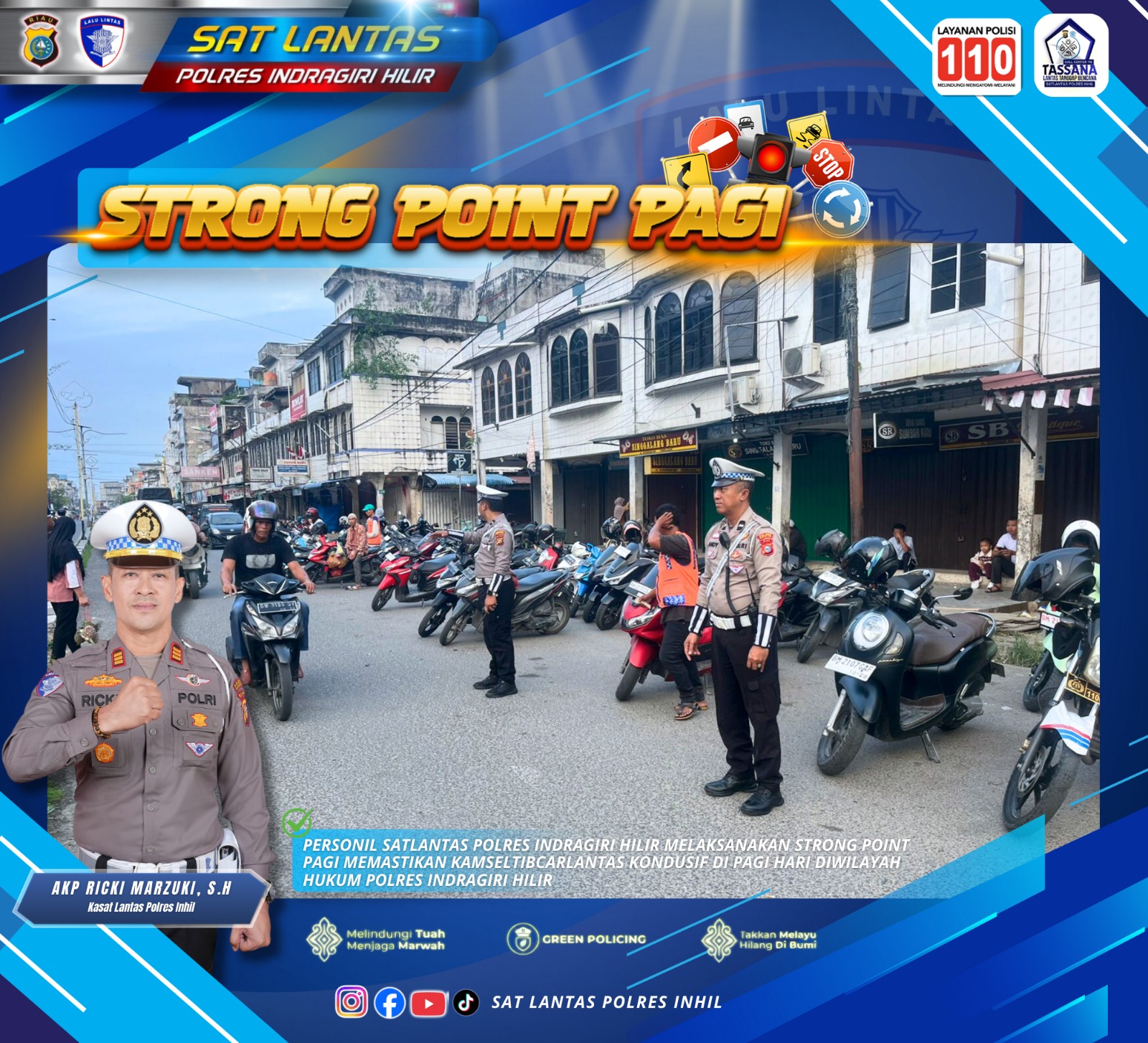 Kapolres Indragiri Hilir, AKBP Farouk Oktora, menyampaikan bahwa kegiatan strong point pagi merupakan salah satu bentuk kehadiran Polri di tengah masyarakat dalam memberikan pelayanan dan menciptakan rasa aman di jalan raya.