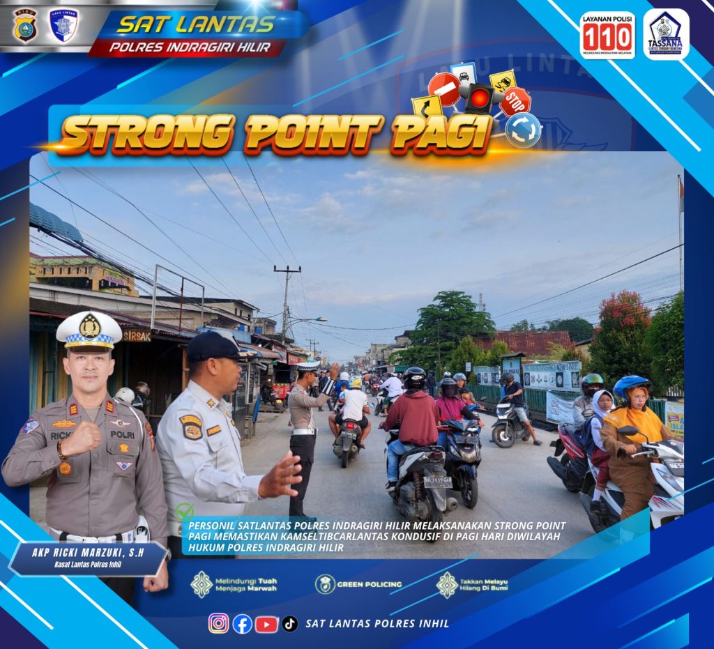 Tembilahan – Personel Satuan Lalu Lintas (Satlantas) Polres Indragiri Hilir melaksanakan kegiatan strong point pagi guna memastikan keamanan, keselamatan, ketertiban, dan kelancaran lalu lintas (kamseltibcarlantas) tetap kondusif di wilayah hukum Polres Indragiri Hilir, Senin (12/1/2026).