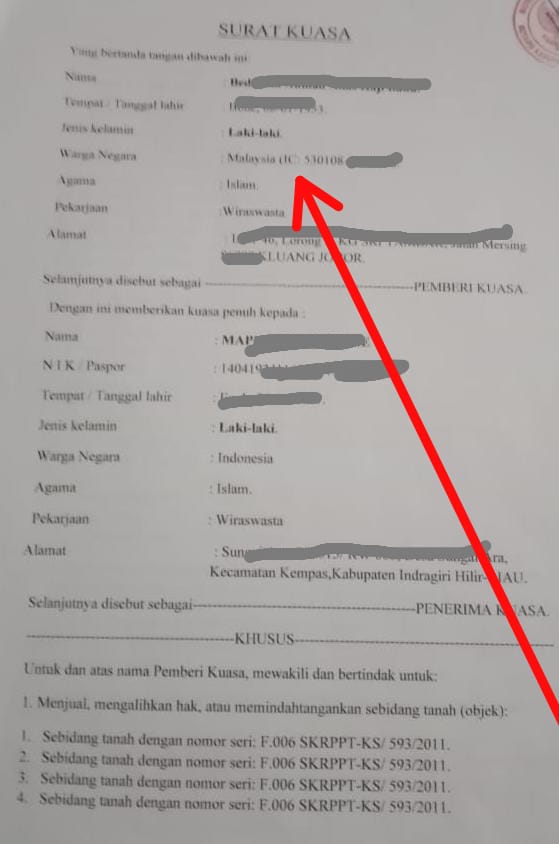Dalam redaksi surat kuasa tersebut tercantum nama HB berkewarganegaraan Malaysia dengan nomor IC : 530108-XX-XXXX, beralamat Johor. Kemudian memberikan kuasa kepada Ma warga negara Indonesia, NIK : 140419XXXXXXXXXX, beralamat di Sungai Ara, Kecamatan Kempas.
