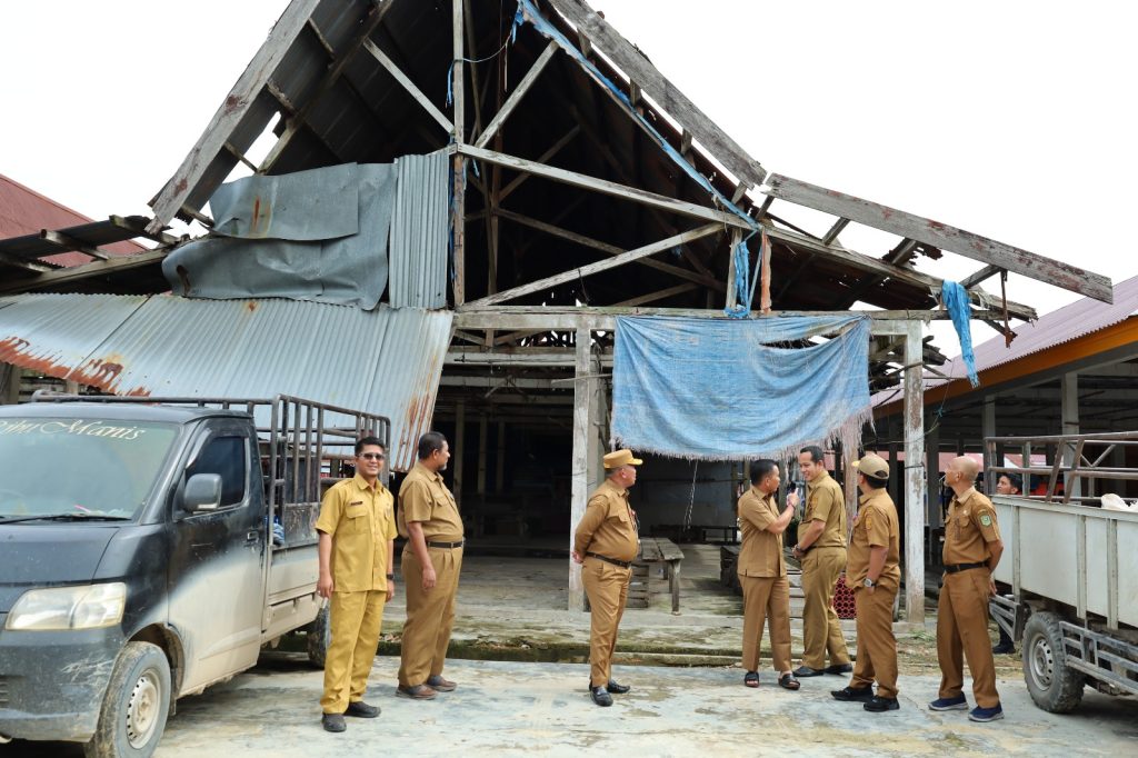 LACAK KRIMINAL. Dayun – Sekretaris Daerah (Sekda) Kabupaten Siak, Mahadar, meninjau kondisi los Pasar Kampung Sialang Sakit, Dayun, Siak pasca di terjang angin puting beliung beberapa waktu lalu.